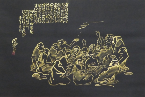 門水独特の剽軽な仏画を紺地金泥で描いた掛軸です