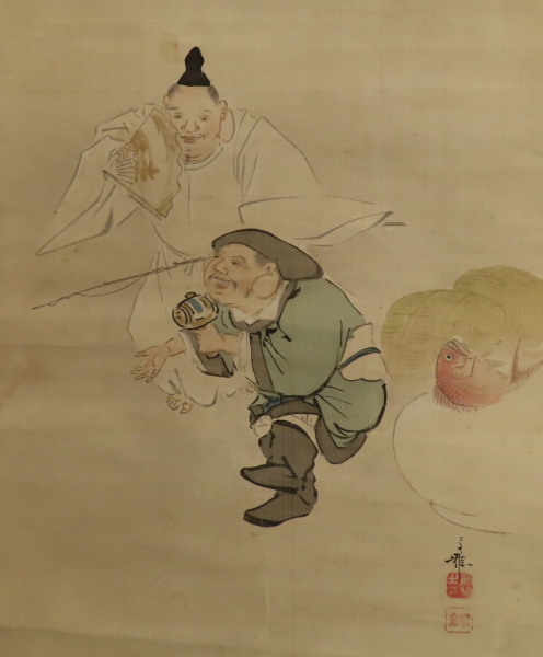 恵比寿と大黒と思われる二人が三河万歳をしている様子を描いた掛軸です