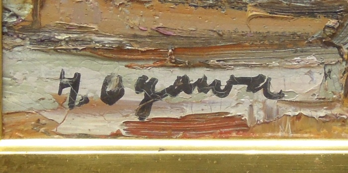 油彩絵具の酸化により画面全体にクラックが入っておりますが、製作過程上の物で作品表現の一つだと捉えられます。